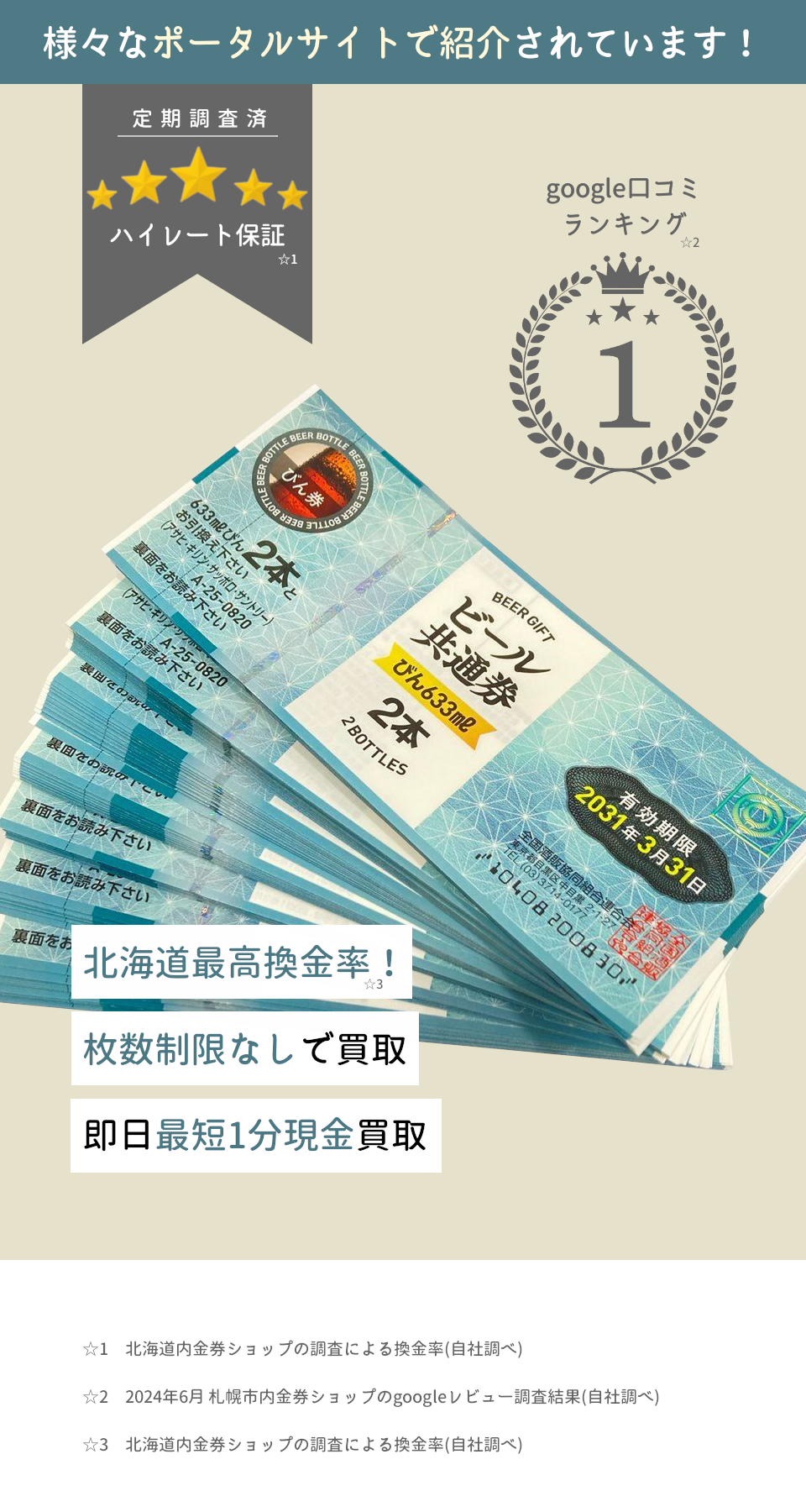 実際にお店に行きましたが金券が札幌市内で一番高かったです。jcbが他店で95%のところ、キンケンセブンさんは96.5%でした。また金券売る際は利用します。